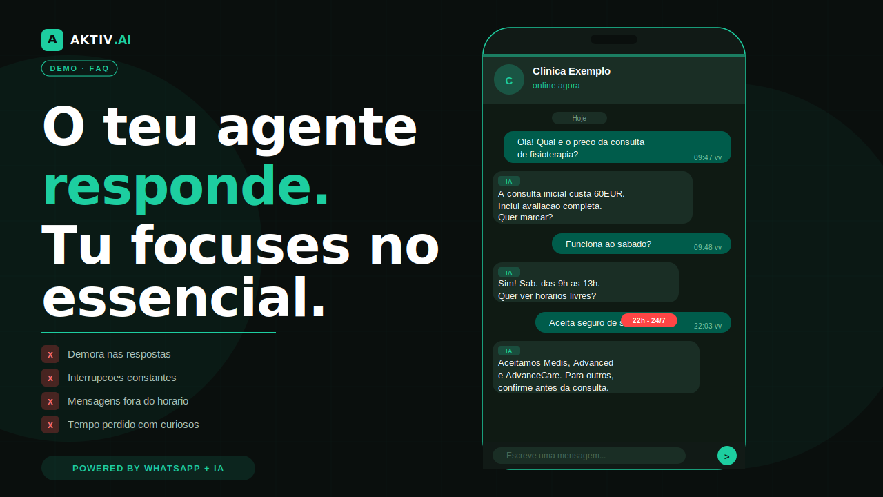 O agente responde automaticamente, em menos de 30 segundos, às perguntas mais frequentes : horários, preços, serviços, etc, 24h/24, 7 dias por semana, sem intervenção humana.