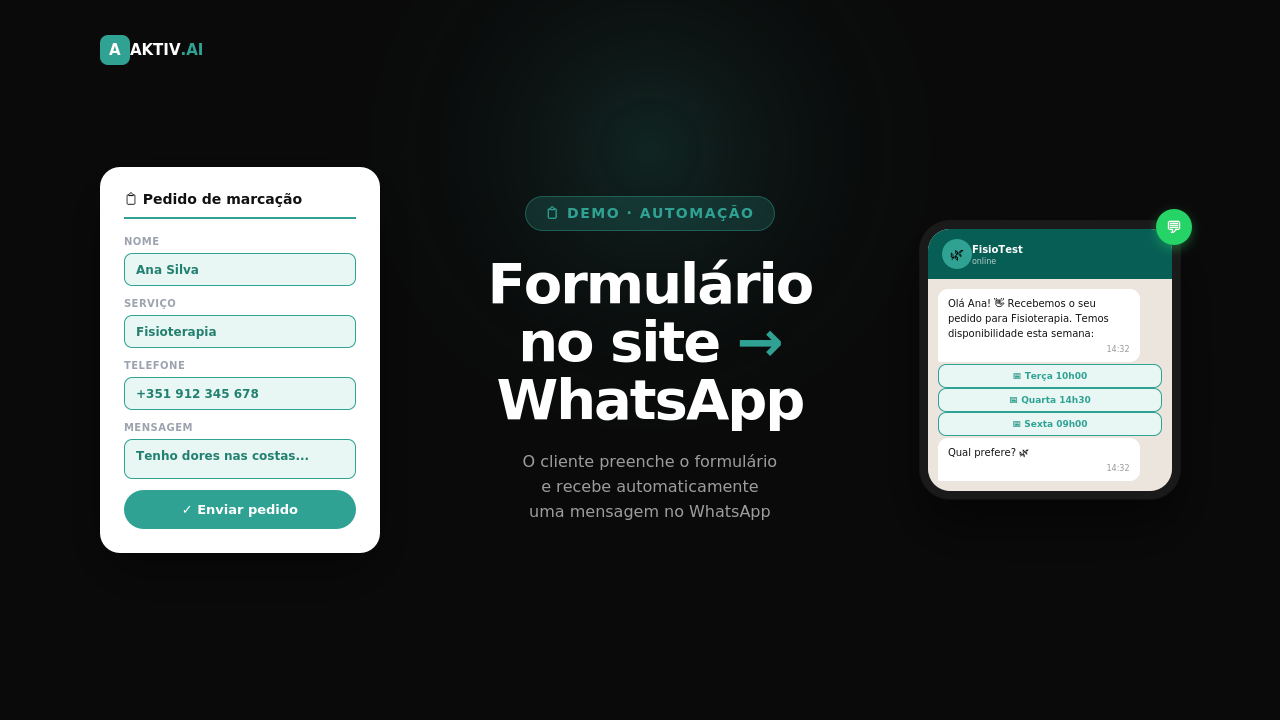 O cliente preenche um formulário no site e recebe automaticamente uma mensagem WhatsApp do agente para responder às duvidas ou efetuar a marcação na hora com o cliente.