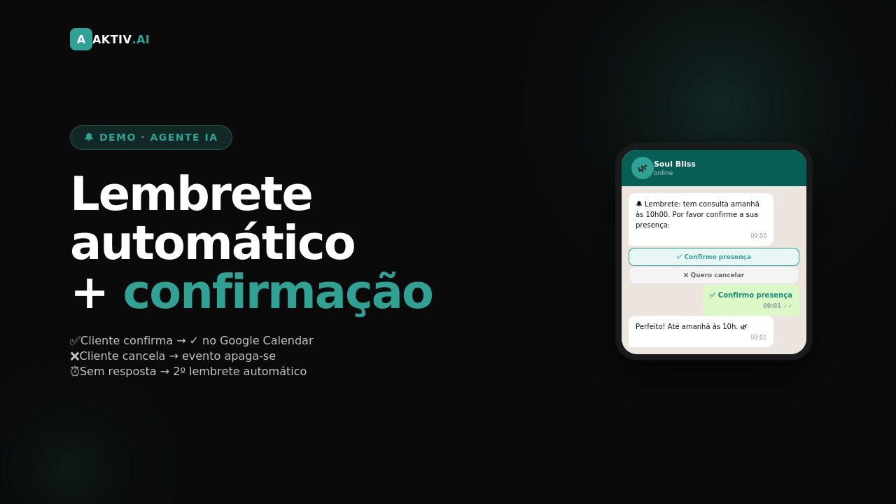O agente envia um lembrete antes da consulta D-1 e pede confirmação. Se confirmado, aparece o ✓ no Google calendar. Se cancelado, o evento apaga-se e envia um email à clínica.